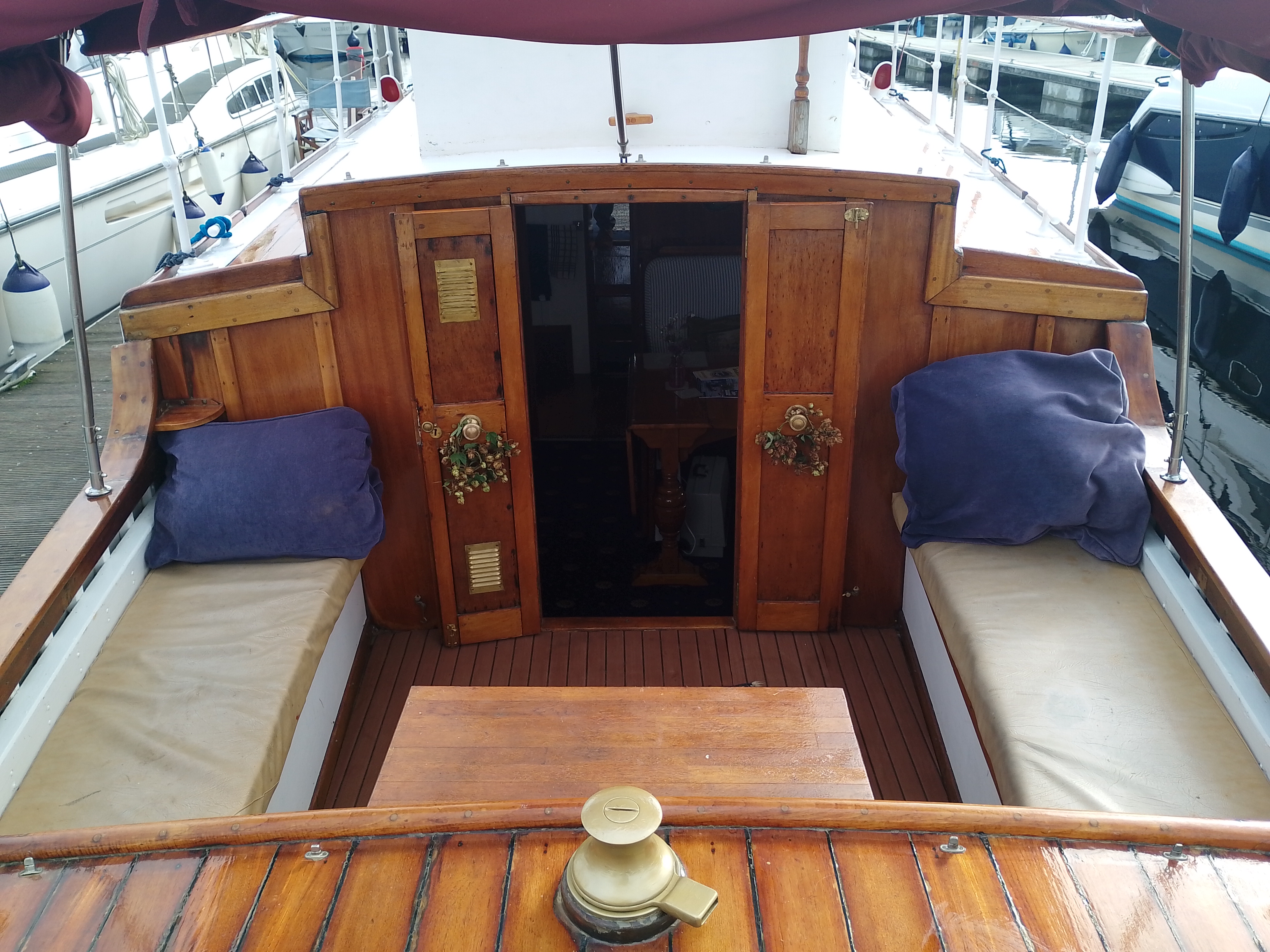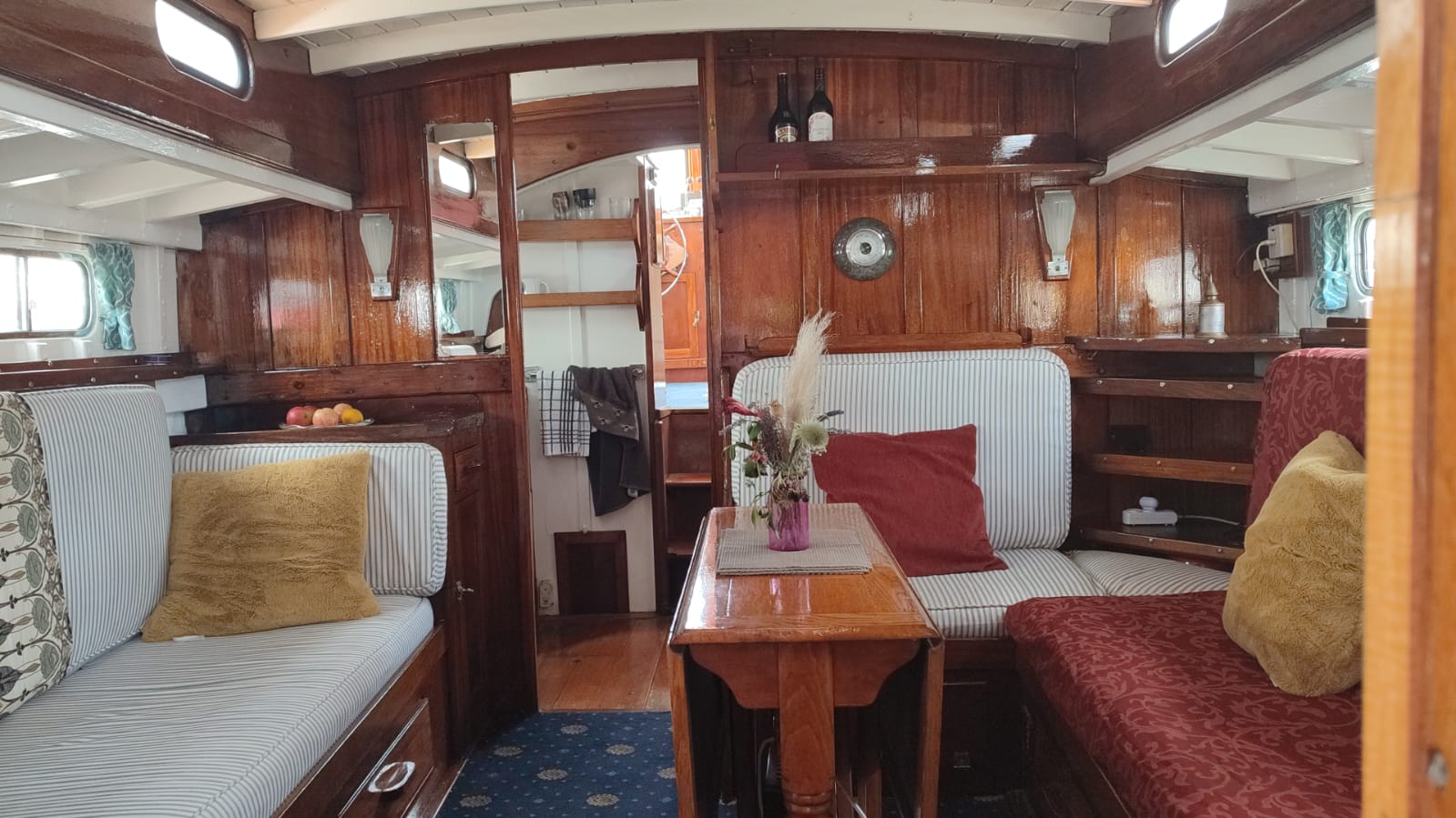 She has teak decks on oak frame, a carvel built mahogany hull and fastened together with brass/ bronze. She is propelled by two Perkins P6 engines and still maintains a mizzen mast and steadying sail for oversea crossings.